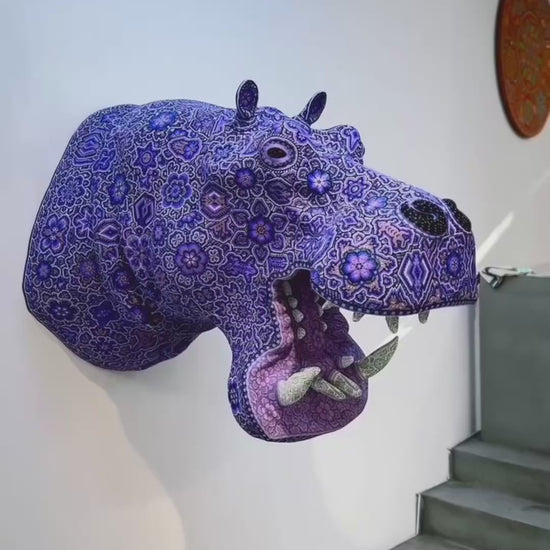 Yurienaka niukieya —The voice of the earth— is a powerful Huichol sculpture representing the head of a hippopotamus, completely covered in hand-applied beads.