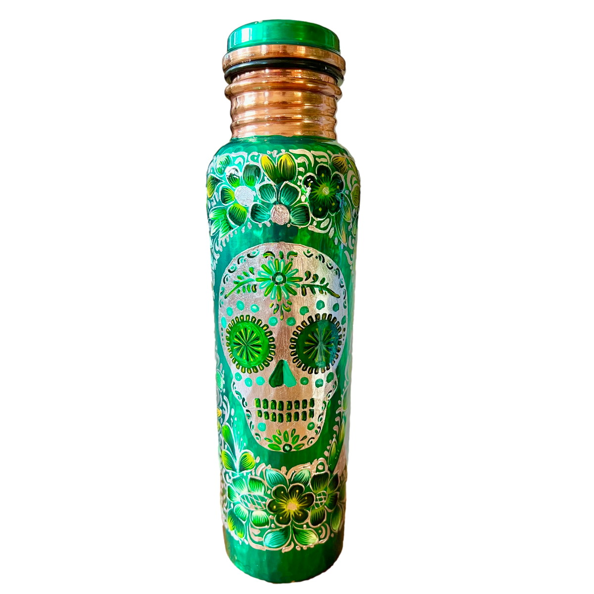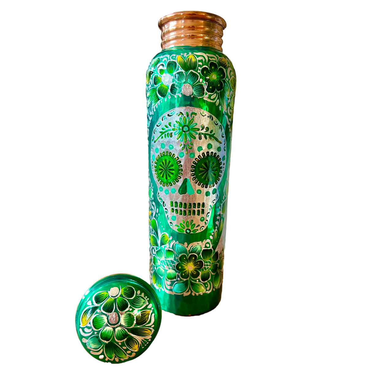 Mexican Copper 1 L / 33 oz. Water Bottle- Hand Painted Green Sugar Skull